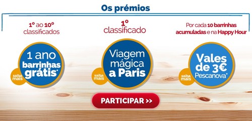 Por cada 10 (dez) Barrinhas / Créditos acumulados, o Participante ganha 1 (um) vale de desconto Pescanova no valor de 3€.